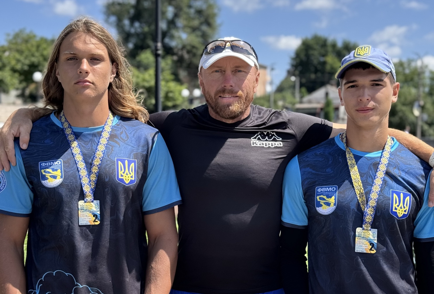 Срібні призери юнацького чемпіонату України Олександр ПАВЛЕНКО (зліва) і Єгор ВЛАСЕНКО з головним тренером збірної Миколаївської області Сергієм МОТОРНИМ, який готував екіпаж